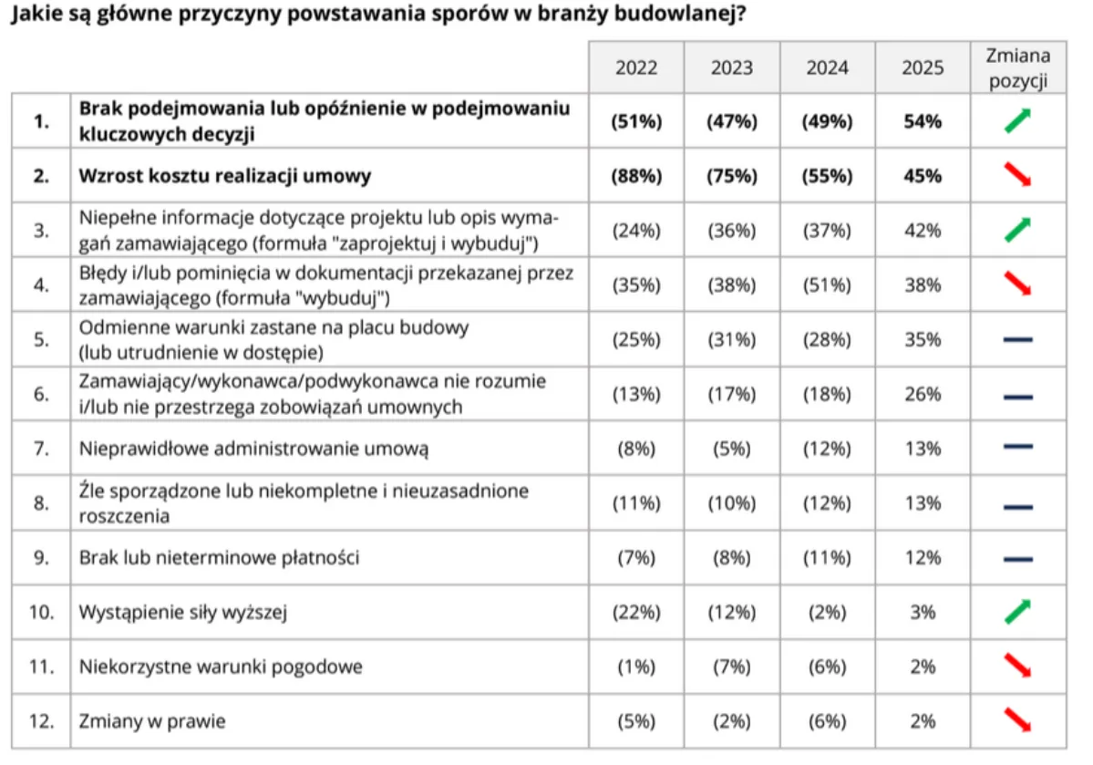 Wyniki raportu CAS wskazują, że najistotniejszym czynnikiem generującym spory, będącym silnie powiązanym z powstawaniem opóźnień, jest brak podejmowania lub opóźnienie w podejmowaniu kluczowych decyzji (54%). Oznacza to, że ponad połowa Ankietowanych wskazuje na niewydolność procesu decyzyjnego, która bezpośrednio przekłada się na opóźnienia i zakłócenia w realizacji robót oraz harmonogramu.