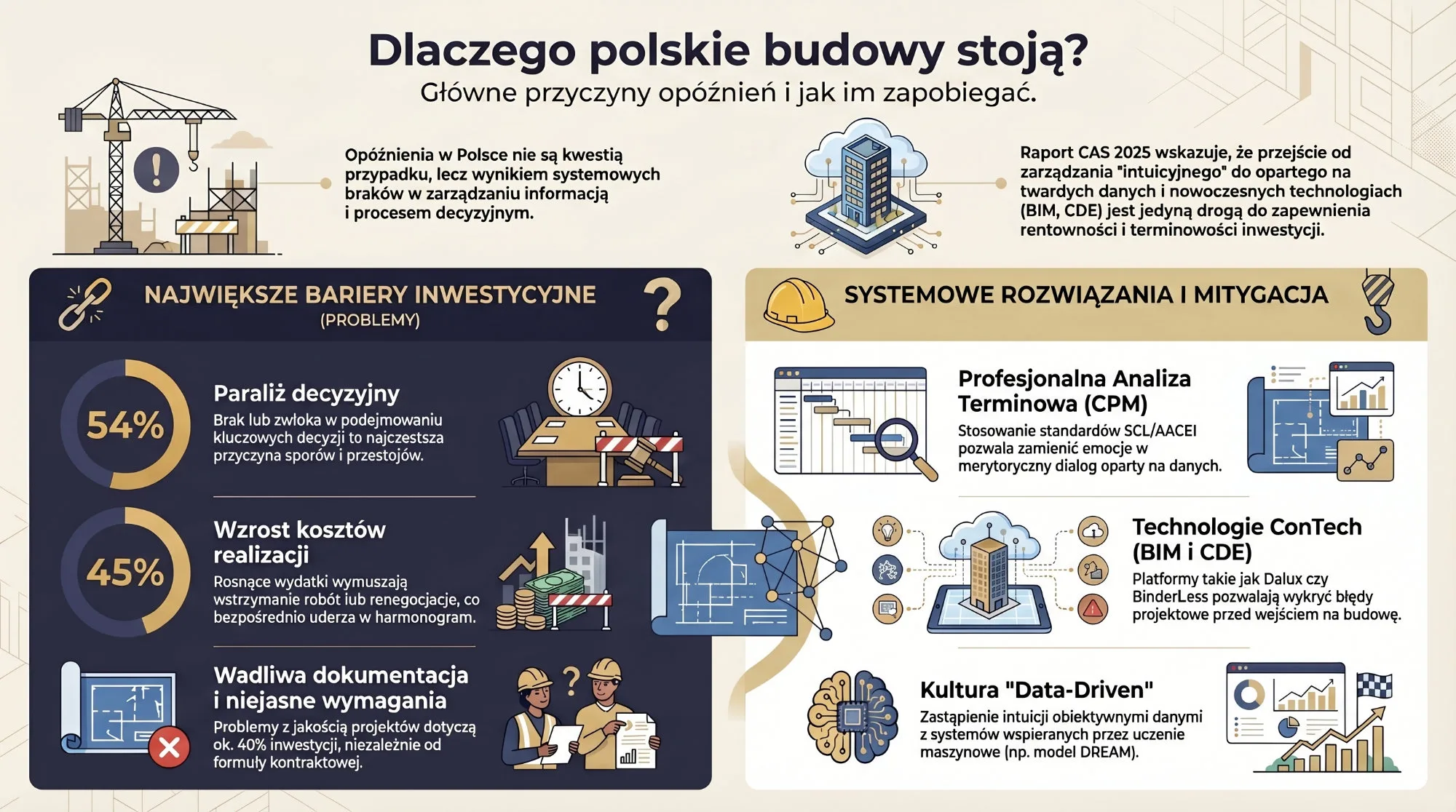 Analiza danych z najnowszego raportu CAS oraz codzienna praktyka w obszarze analiz terminowych prowadzą do jednoznacznego wniosku: opóźnienia w polskich inwestycjach budowlanych nie są kwestią przypadku, lecz wynikiem systemowych deficytów w zarządzaniu informacją i procesem decyzyjnym.