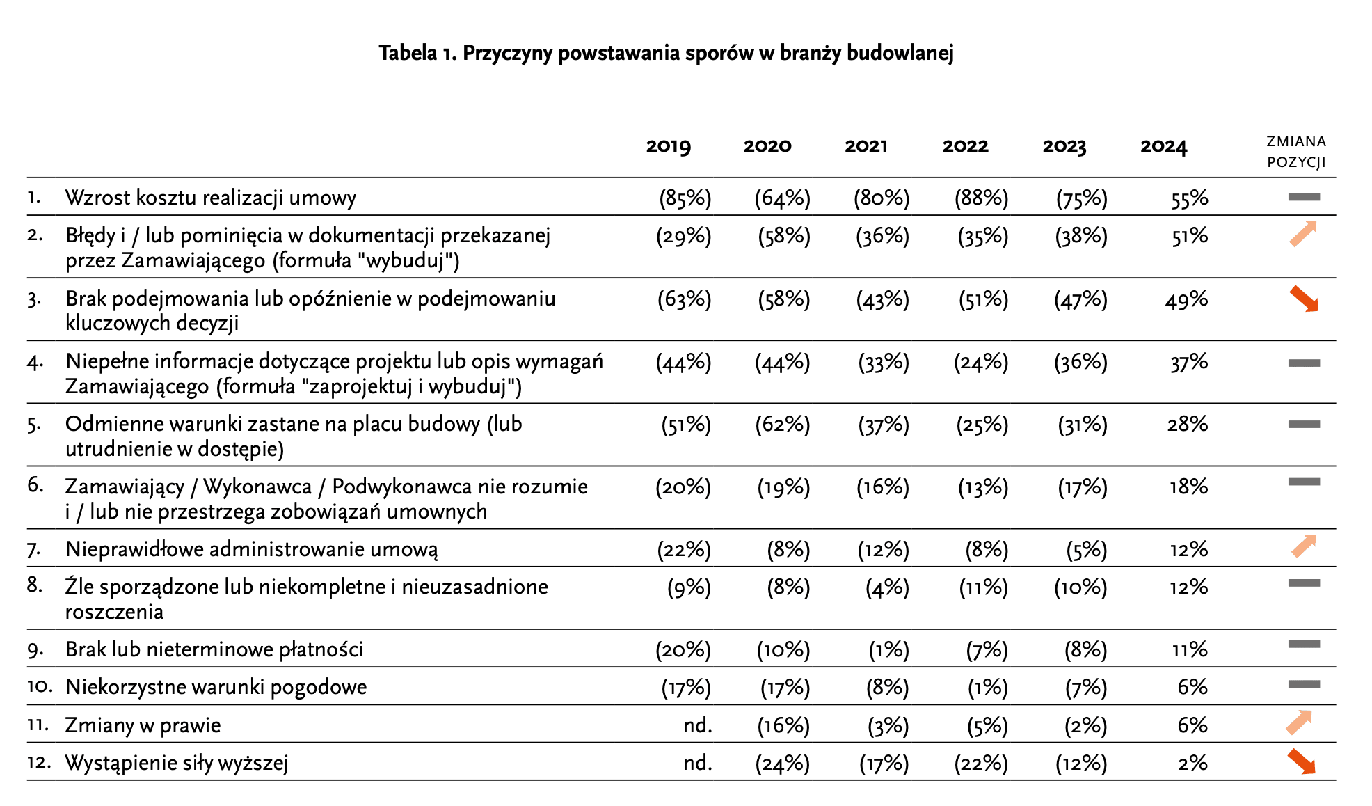 Niezmiennie jako główną przyczynę powstawania sporów branży budowlanej, Respondenci wskazali wzrost kosztów realizacji umowy (55% wskazań). Obserwowany spadek udziału tej odpowiedzi względem lat poprzednich, tj. 75% w roku 2023 czy aż 88% w roku 2022 wynika najprawdopodobniej z coraz częściej stosowanych klauzul waloryzacyjnych uwzględniających zmiany cen. To by także oznaczało, że rozwiązania przyjęte do systemu zamówień publicznych oraz wytyczne Prokuratorii Generalnej RP i Urzędu Zamówień Publicznych przynoszą rezultaty w praktyce.