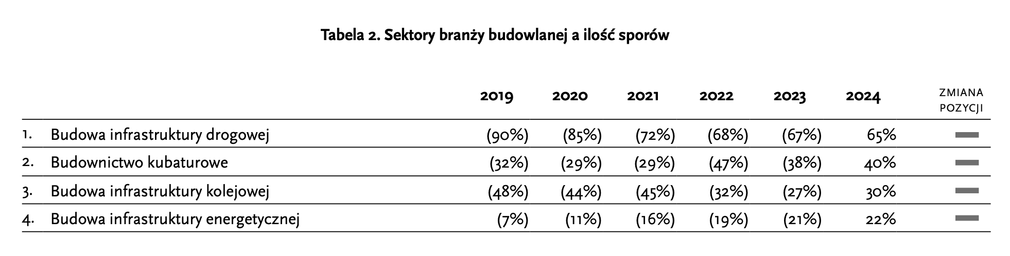 Na pierwszym miejscu, niezmiennie, znalazło się budownictwo infrastruktury drogowej (65%). Drugie miejsce przypadło budownictwu kubaturowemu (40%), dalej budownictwu infrastruktury kolejowej (30%), na ostatnim miejscu znalazło się zyskujące popularność (od 7% w roku 2019 do 22% w roku 2024) budownictwo infrastruktury energetycznej. Należy zauważyć, że wartości procentowe opisujące głosy specjalistów wykazują tendencję ku wyrównaniu, chociaż całkowite wyrównanie na chwilę obecną wydaje się niemożliwe do osiągnięcia.